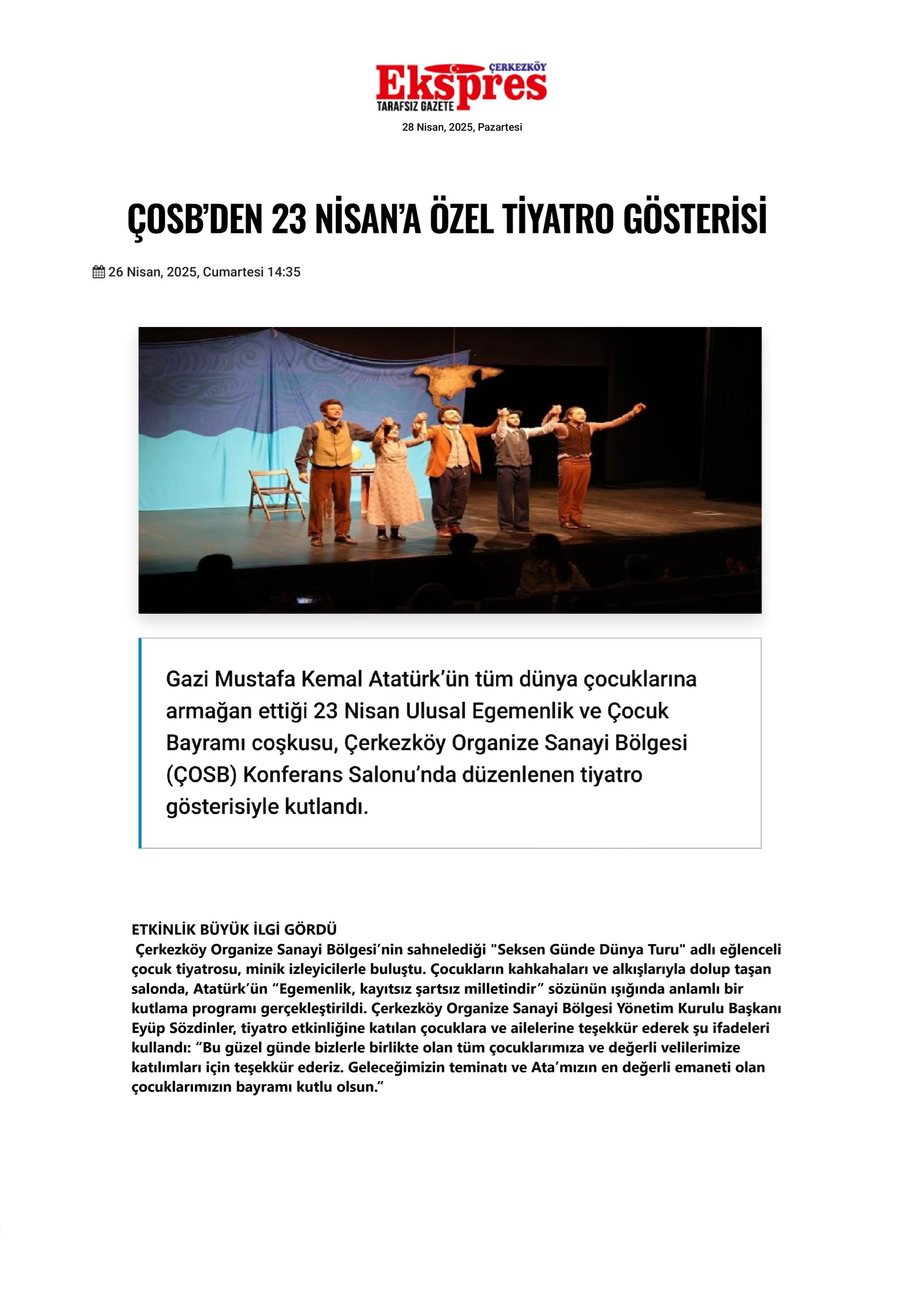 ÇOSB’DEN 23 NİSAN’A ÖZEL TİYATRO GÖSTERİSİ
