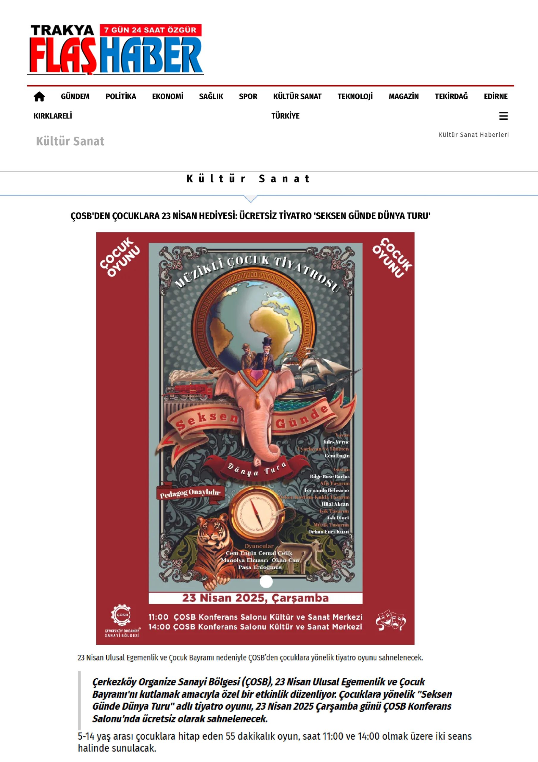 ÇOSB’DEN ÇOCUKLARA 23 NİSAN HEDİYESİ: ÜCRETSİZ TİYATRO ‘SEKSEN GÜNDE DÜNYA TURU
