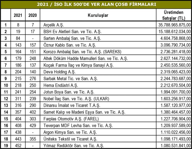 İstanbul Sanayi Odası’nın (İSO) açıkladığı ‘Türkiye’nin En Büyük 500 Sanayi Kuruluşu’ araştırmasının 2021 sonuçlarında Bölgemizi gururlandıran tablo ortaya çıktı. Araştırma sonuçlarına göre, Bölgemizden 19 firma İlk 500 Büyük Sanayi Kuruluşu arasında yer almayı başardı. Yönetim Kurulu Başkanımız Eyüp Sözdinler 19 firmamızı tebrik ederek, başarılı çalışmalarının devam etmesi temennisinde bulundu.