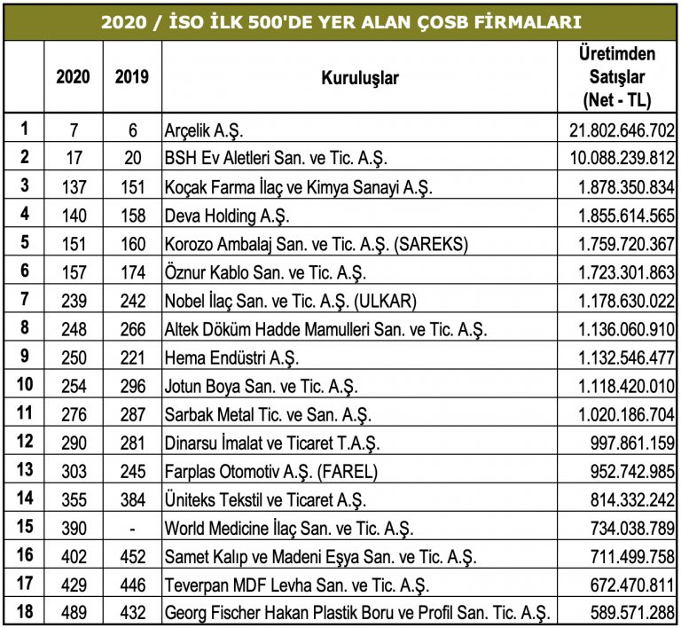 Türkiye’nin sanayi konusundaki en kapsamlı ve uzun soluklu çalışması olan ‘Türkiye’nin En Büyük 500 Sanayi Kuruluşu’ araştırmasının 2020 yılı rakamlarına göre ÇOSB’den 18 firma ülkemizin en büyük 500 firması arasında yer almayı başardı.