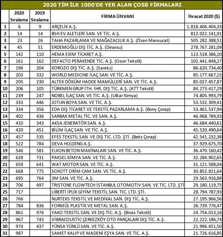 İstanbul Sanayi Odası’nın “En Büyük 500 Sanayi Kuruluşu-2020” araştırmasına ÇOSB’den 18 firma girmişti. İSO’nun “En Büyük İkinci 500 Sanayi Kuruluşu-2020” listesinde ise ÇOSB’den 19 firma yer almıştı. Böylece ÇOSB’den 37 firma sanayinin devler liginde yer almıştı. Geçtiğimiz yıl TİM’in “Türkiye’nin En Büyük 1000 İhracatçı Firması” listesinde ÇOSB’den 28 firma yer almıştı.
